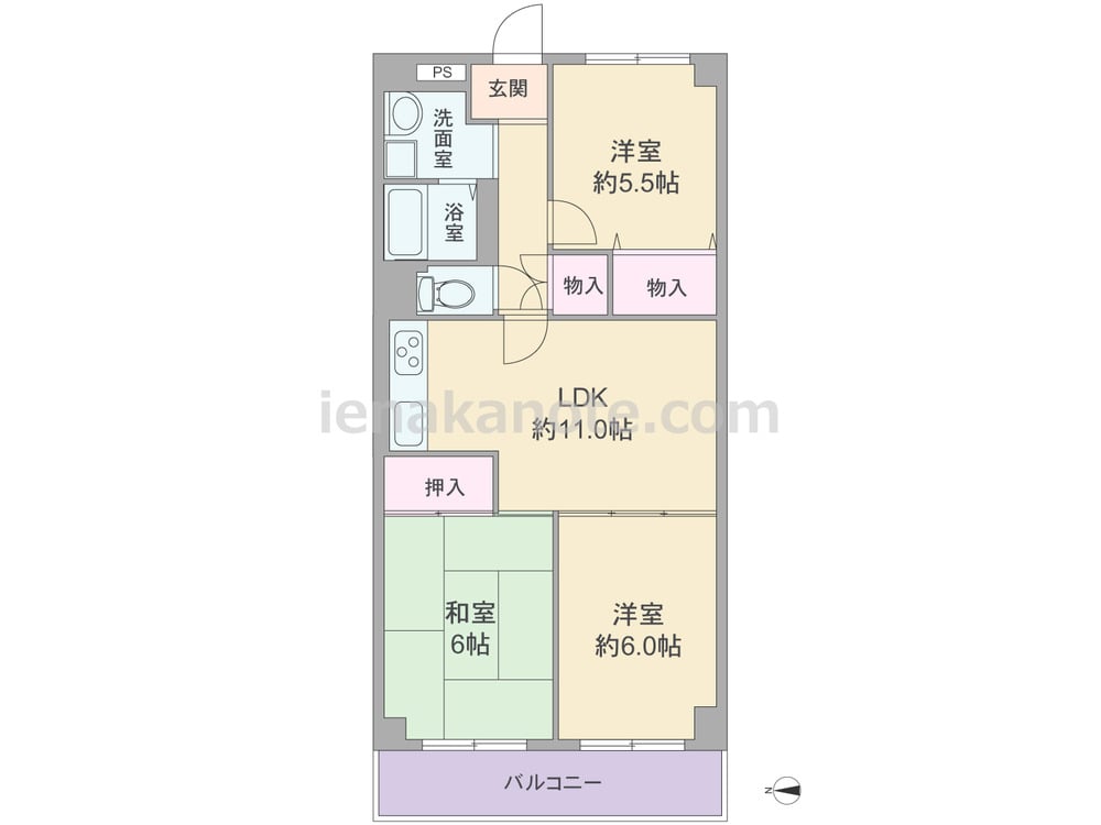 専有面積61.6平米の3LDK。センターリビングのプランでLDKは約11.0帖、キッチンは開放的なI型の壁付け・オープンタイプ。洋室約6.0帖には収納スペースがありませんが、扉を開放すればLDK約17.0帖大としても使う事が出来ます。