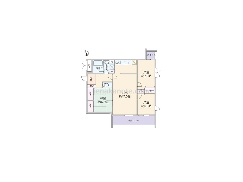専有面積78.58平米の3LDK。住居の窓が共用廊下に面していない、プライバシー性の高いプラン。LDKが中央に配置され、各個室にはLDKを通ってアクセスする為、家族のコミュニケーションの機会が増えます。LDKと和室が続き間で、和室の襖を開放すれば、約23.2帖大の一つの空間としても使用可能。キッチンはリビング・ダイニングに生活感が出にくい独立型。各居室に収納スペース付き。バルコニーが2カ所にあります。