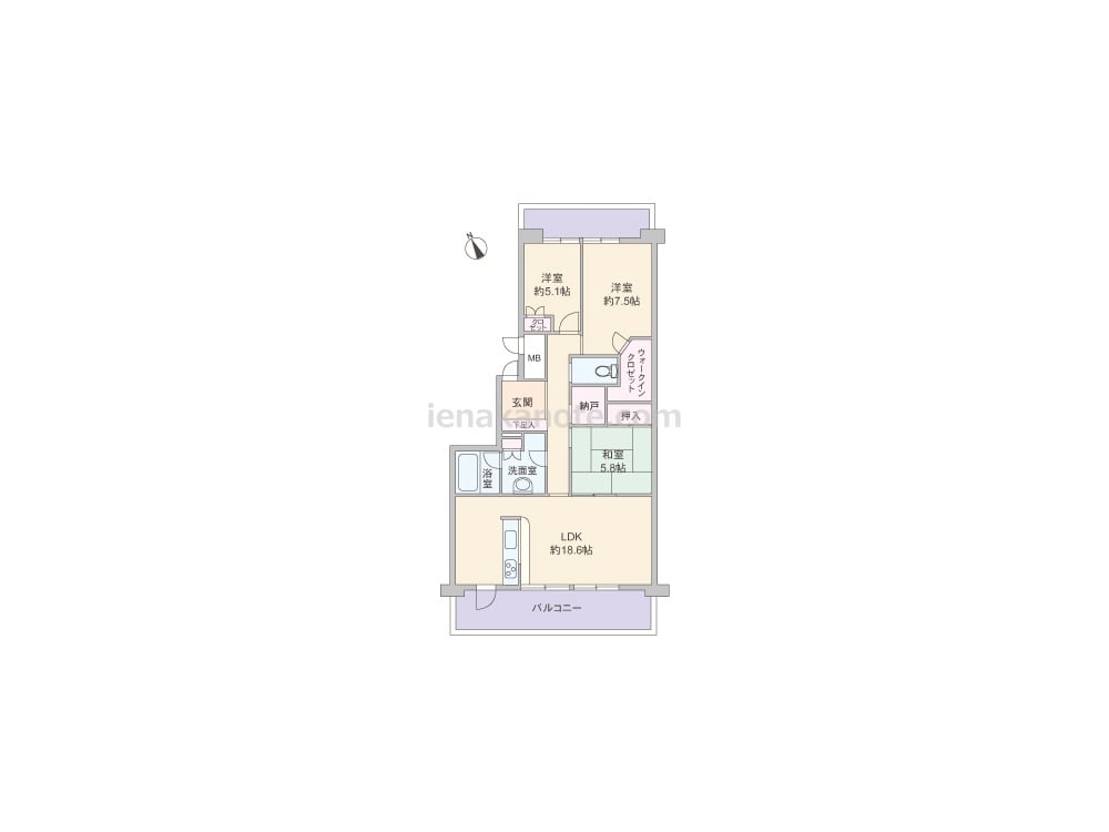 専有面積87.68平米の3LDK。センターインのプランで、プライベートスペースとパブリックスペースの使い分けがしやすいのが特徴。南北両面にバルコニーがあります。LDKは全体がバルコニーに面しているため開放感があります。キッチンはカウンタータイプ。バルコニーへ出られる2WAY。リビングには和室5.8帖が隣接しており、襖を開放すれば約24.4帖の空間としても使えます。また各室に収納スペース付きで、ウォークインクロゼットや納戸があり、収納が豊富です。