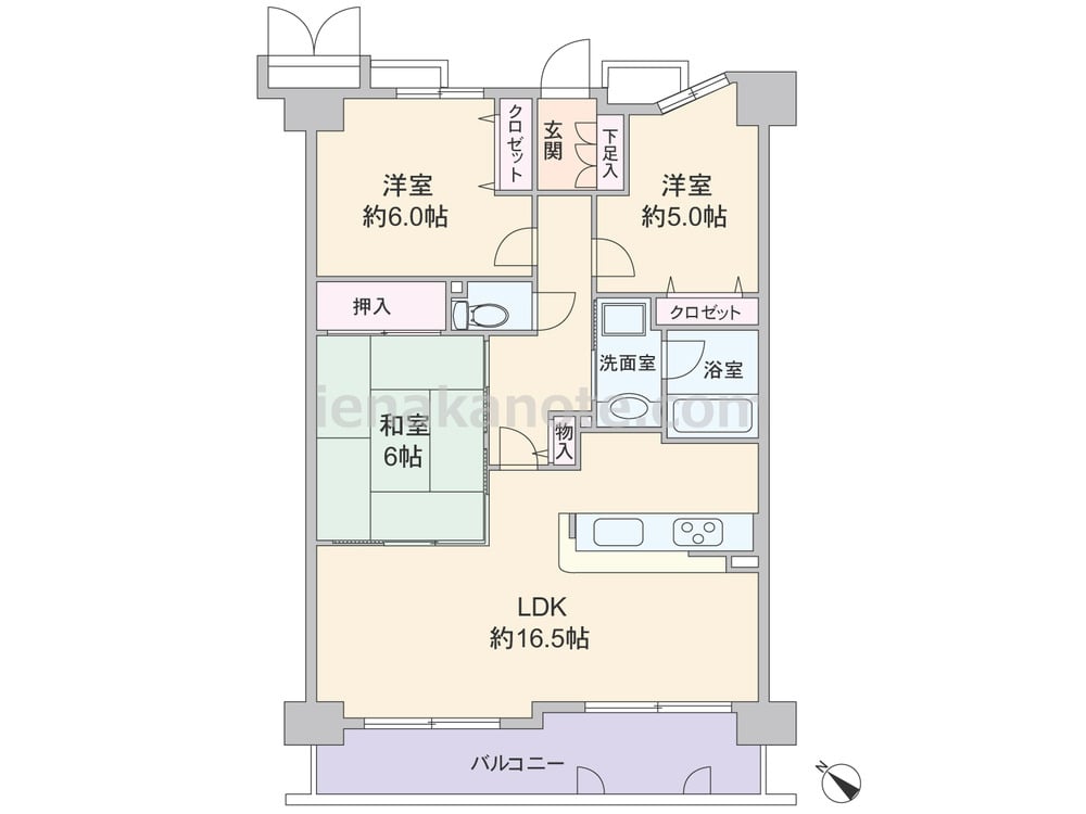 専有面積72.78平米の3LDK。横長リビングのプラン。キッチンは家族の顔を見ながら作業が出来る対面カウンタータイプの仕様。LDK約16.5帖には和室6帖が隣接しており、引き戸を開放すれば約22.5帖大の空間に利用出来ます。室内廊下からも出入りでき、来客時には客間にしてもよさそう。各居室と室内廊下に収納付き。バルコニー約10.71平米は一部出幅があります。