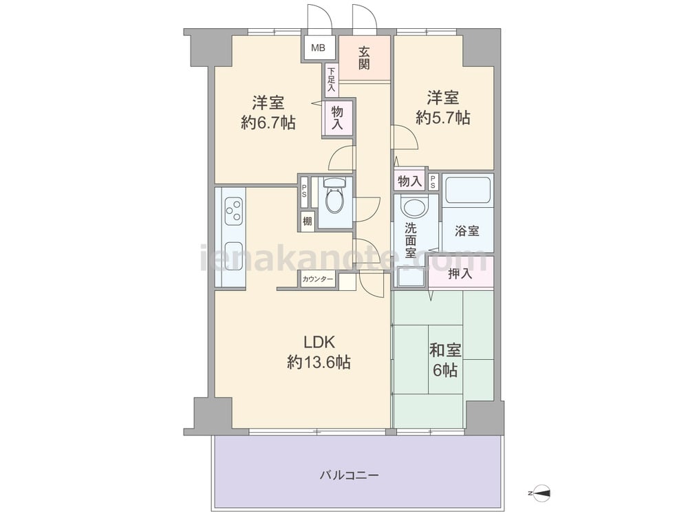専有面積72.00平米の3LDK。LDK約13.6帖には和室6帖が隣接しており、引き戸を開放すれば約19.6帖大の空間にする事が可能。生活感の出やすいキッチンは独立型のため、リビング・ダイニングはくつろぎの空間を演出できます。各居室に収納スペース付き。バルコニーは約12.96平米とゆとりがあります。