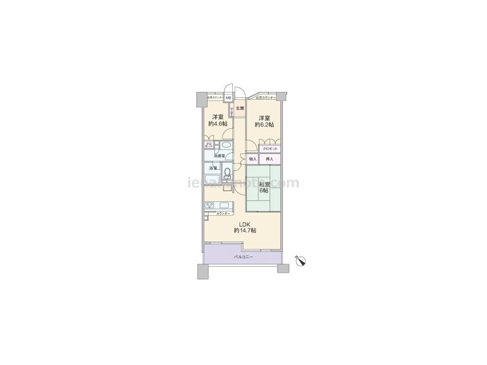 専有面積70.02平米の3LDK。キッチンはカウンタータイプ。LDKの窓はコーナーサッシで、開放感があります。各部屋に収納スペース付き。LDKと和室6帖が続き間で、約20.7帖の一つの空間としても使用出来ます。