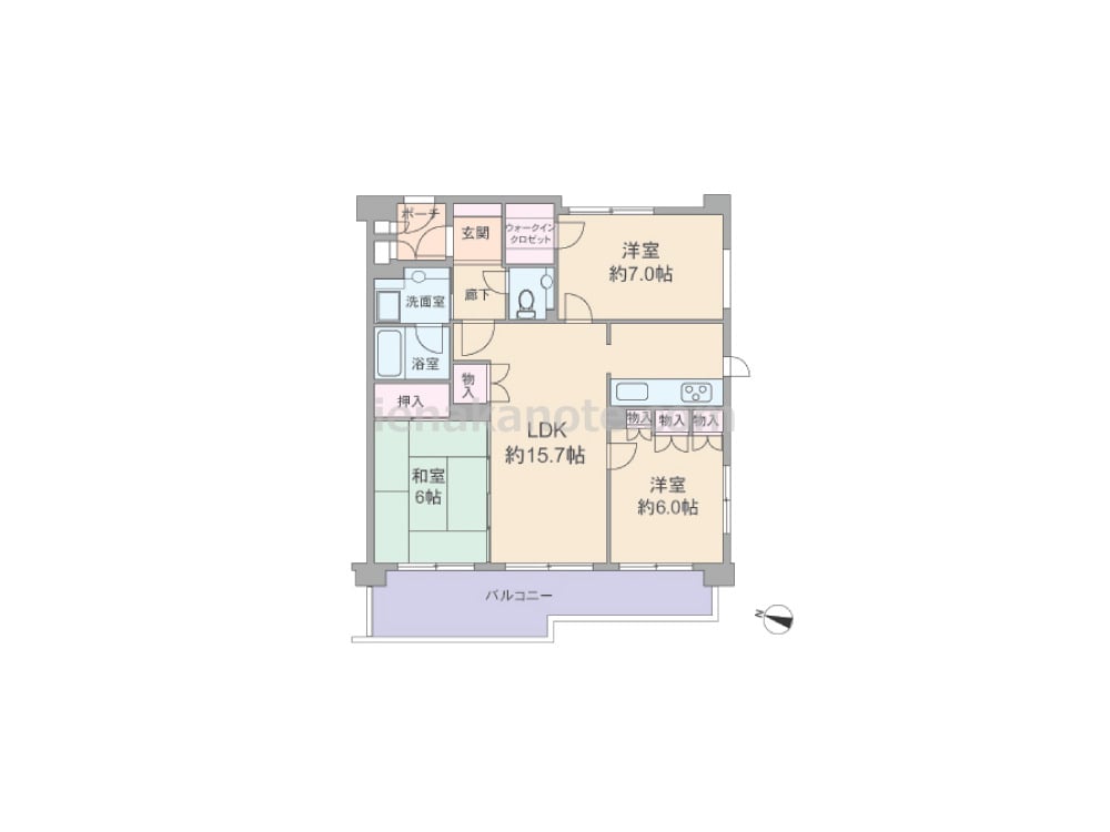 専有面積76.6平米の3LDK。玄関前にプライバシーに配慮されたポーチ付き。ワイドスパンのプランで、LDKを含む3部屋がバルコニーに面しています。全室6帖以上の広さで、各部屋に収納スペース付き。約7帖の主寝室にはウォークインクロゼットがあります。バルコニーはゆとりがあり、ガーデニングスペースやアウトドアリビングとしても使えます。