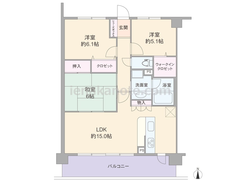専有面積72.20平米の3LDK。横長リビングのプラン。キッチンはリビング全体を見渡せる対面式で、キッチン横にはバルコニーへの勝手口があります。和室6帖へはLDKと室内廊下の2カ所から出入りが可能。全部屋に収納が設けられています。バルコニーはスペースにゆとりがあり、ガーデニングを楽しんだり、テーブルセットを置いてアウトドアリビングにしてもよさそうです。
