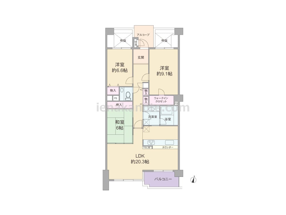専有面積97.7平米の3LDK。玄関前にアルコーブがあり、各居室と廊下との間には吹き抜けがあるなど、プライバシーに配慮されています。LDKは広々20.3帖、キッチンはカウンタータイプ。主寝室は9.1帖、ウォークインクロゼット付き。トイレには手洗いカウンターがあるなど、随所にゆとりが見られます。