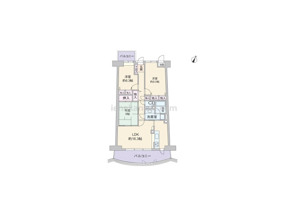 専有面積84.54平米の3LDK。南北両面にバルコニー付き。キッチンはバルコニーに面して配置され便利な勝手口付き。洗面室にも直接アクセス可能。カウンタータイプの為、家事中も家族に目が届きます。LDKと和室が続き間で、約22.3帖の一つの空間としても使用可能。和室には扉が2カ所にあり、廊下からも直接アクセスできる為、個室や客間としても使いやすくなっています。主寝室は約8帖大。各部屋の他、廊下に面して物入付き。バルコニーは出幅があり、ガーデニングスペースやアウトドアリビングとしても使用出来ます。