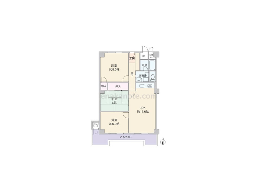 専有面積70.91平米の3LDK。全部屋6帖以上、主寝室は約8帖のゆとりがあります。キッチンは開放的な壁付け・オープンタイプ。トイレは洗面室を通って出入りする造り。洋室約6.0帖には収納がありませんが、その他の居室とバルコニーにトランクルームが付いています。