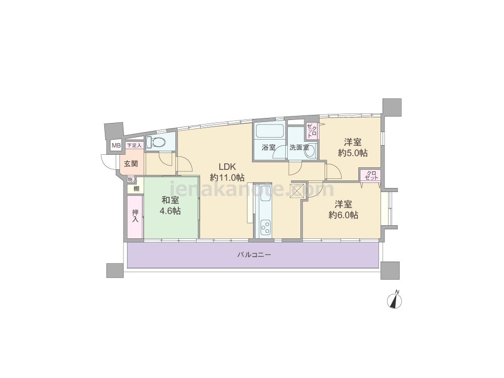 専有面積65.53平米の3LDK。ワイドスパンでたいへん開放的なプラン。LDKは11.0帖、キッチンはカウンタータイプ。LDKと和室が続き間になっており、引き戸を開放するとさらにリビングを広々と使え、センターリビングのため、家族のコミュニケーションの機会が増えそうです。また水回りが1カ所に集約されており、家事動線に優れています。