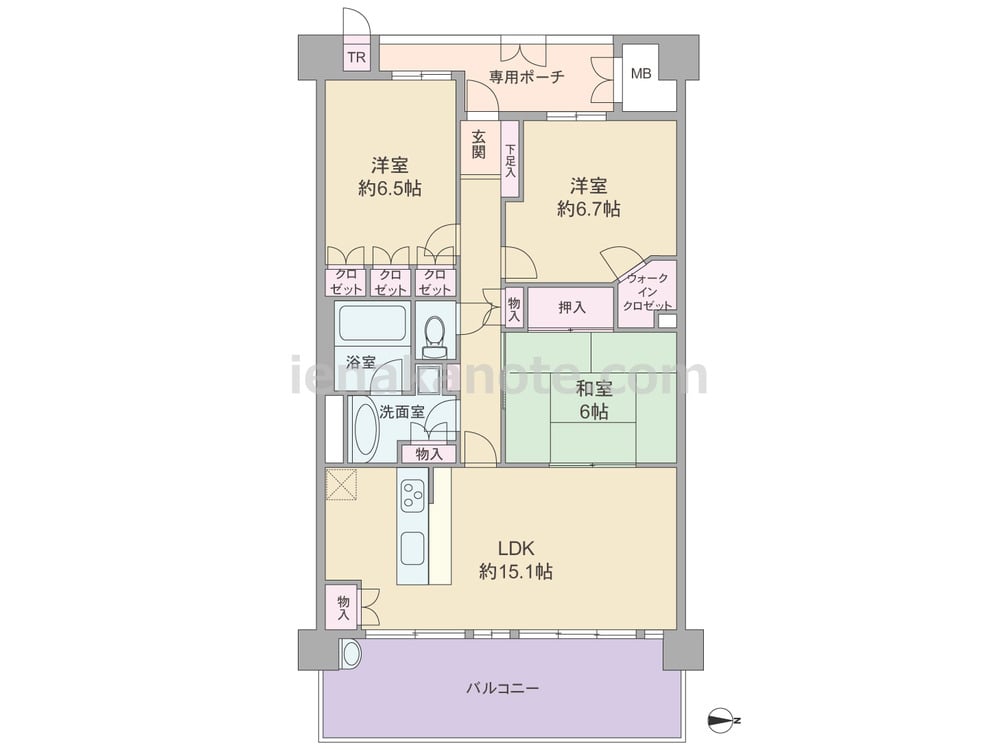 専有面積78.98平米の3LDK。玄関前にはプライベートポーチ付き。LDKは15.1帖、キッチンはカウンタータイプ。主寝室6.7帖にはウォークインクロゼット、ポーチ横にトランクルーム、キッチンや洗面室に物入れ等があり、収納スペースが充実しています。バルコニーは出幅が約2mあり、ガーデニングなども楽しめます。