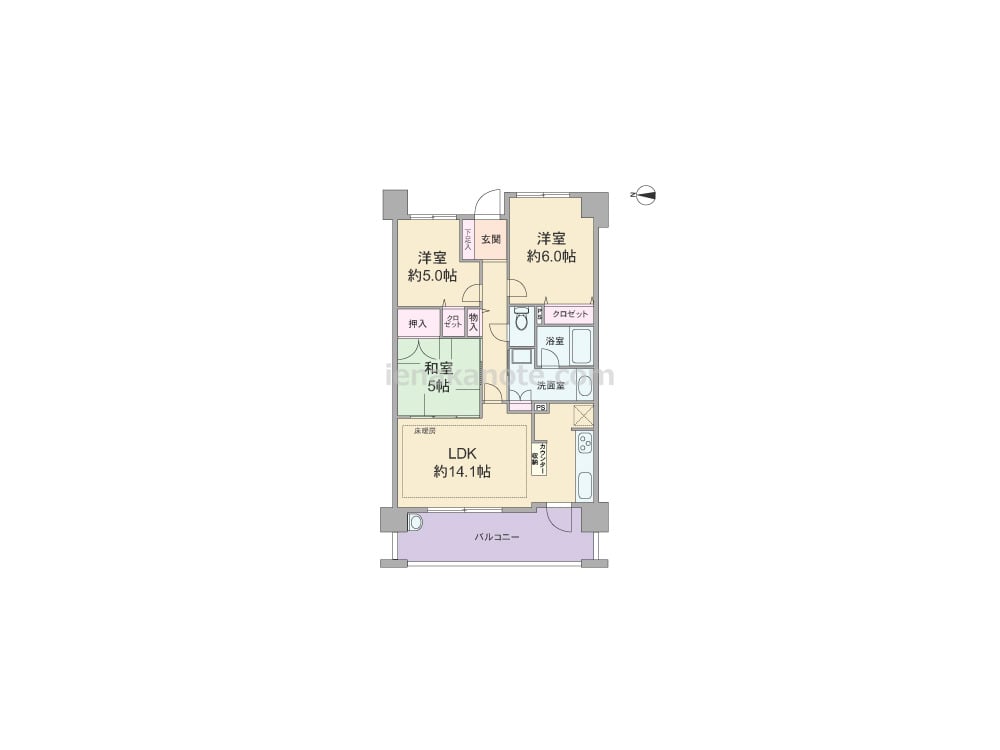 専有面積68.67平米の3LDK。LDKは14.1帖、キッチン背面には使い勝手の良いカウンター、キッチン横にはバルコニーへ出られる勝手口付き。キッチンカウンター下や、洗面室、各室に収納スペースがあります。