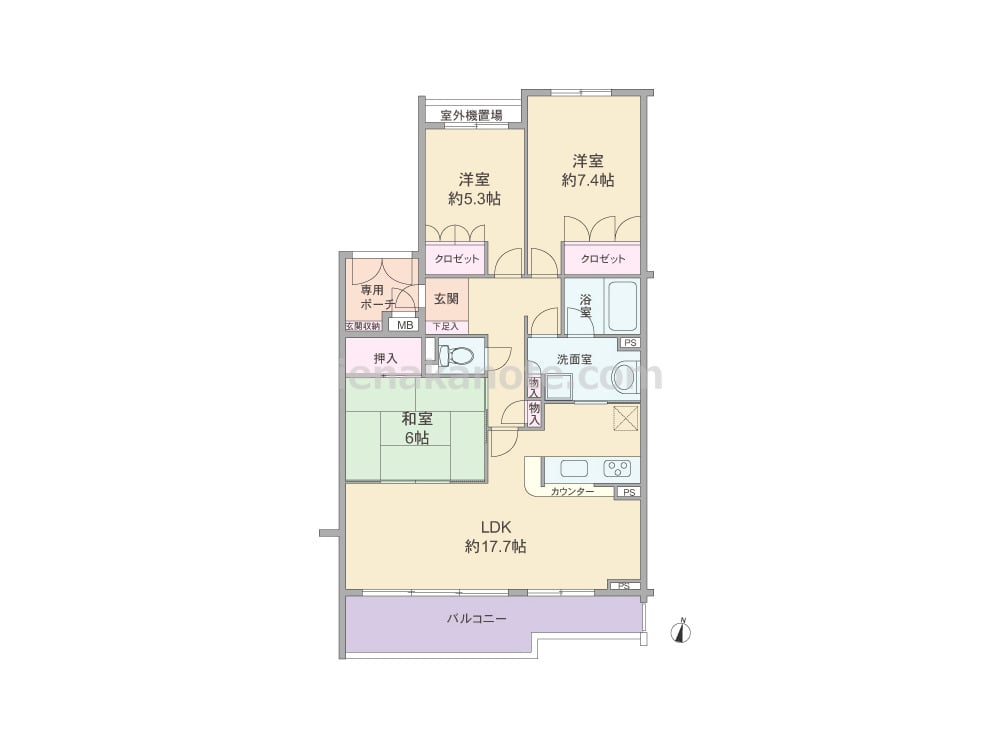 専有面積82.45平米の3LDK。玄関前にプライバシーに配慮されたポーチがあるセンターインのプラン。キッチンはカウンタータイプで、洗面室に直接アクセスできる家事動線にすぐれたツーウエイ。リビング・ダイニングは、窓が大きく、明るく、開放感のある空間。主寝室は約7.4帖大。バルコニーはゆとりがあります。