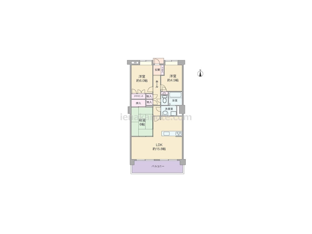 専有面積73.83平米の3LDK。キッチンはカウンタータイプ。LD全体がバルコニーに面しており、開放感があります。またLDKに和室6帖が隣り合っているため、襖を開放すればリビングの延長として和室を利用することができます。各室に収納スペース付きで、廊下にも物入が2ヶ所あり、収納豊富です。