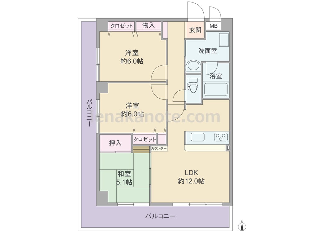 専有面積67.34平米の3LDK。広々としたL字型のバルコニーがあり、全居室がバルコニーに面しています。キッチンはカウンタータイプ。LDKと和室が続き間で、約17.1帖の一つの空間としても使用可能。各部屋に収納スペースがあります。