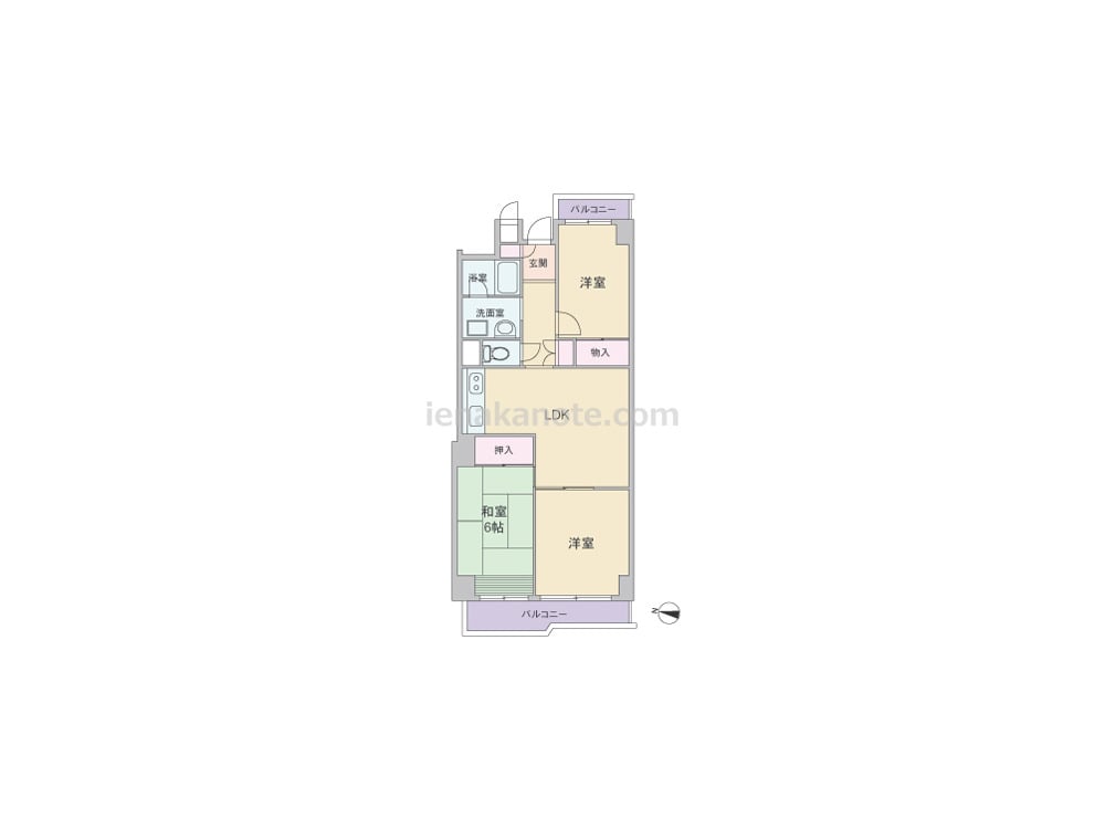 専有面積68.15平米の3LDK。東西両面にバルコニー付きで、直接共用廊下に面した窓がないため、プライバシーを守りやすいプラン。部屋の中央にLDKがあります。キッチンは壁付けタイプで、リビング・ダイニングを広く使える配置です。