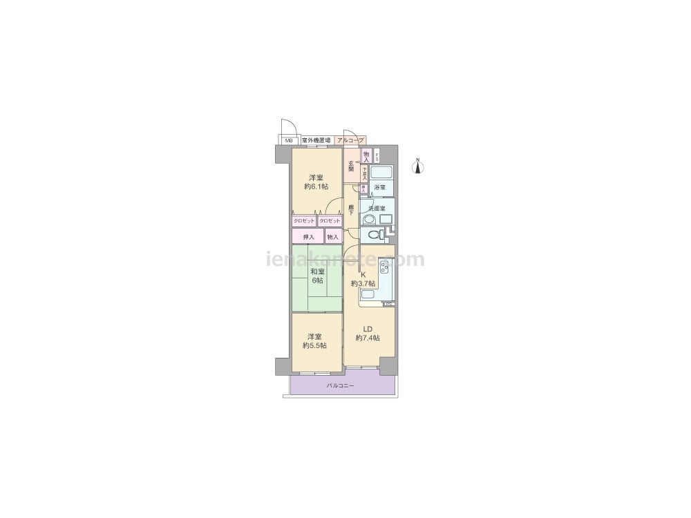 専有面積67.06平米の3LDK。玄関前にアルコーブがあり、プライバシーに配慮されたプラン。キッチンはカウンタータイプで、家事効率の良いL字型。LDKと和室・洋室が続き間になっており、様々なライフシーンに対応できます。各室に収納スペース付きです。
