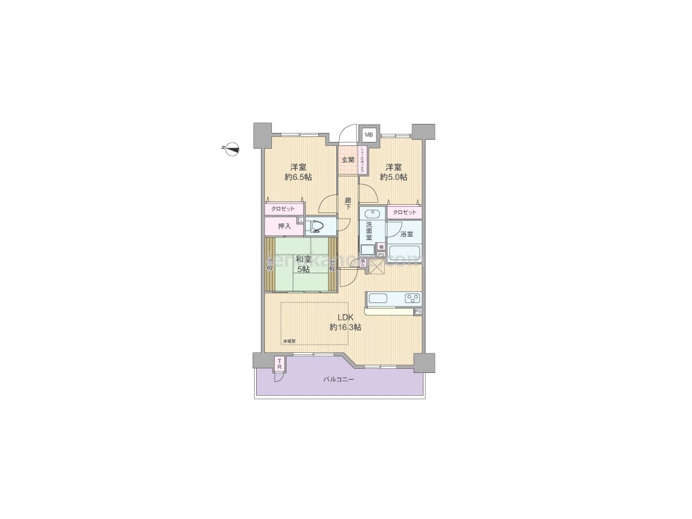 専有面積70.87平米の3LDK。LDKは16.3帖、キッチンはカウンタータイプ。和室の襖を開放すればより広々とリビングを使う事ができ、板間は収納家具などを置くのに便利です。各居室の他に洗面室に物入れ、バルコニーにトランクルームがあるなど収納スペースが充実。バルコニーは約10.84平米のゆとりがあります。