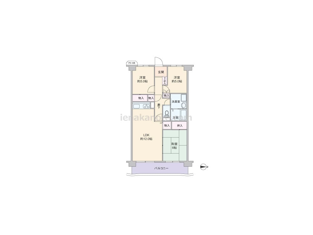 専有面積66.15平米の3LDK。LDK約12.0帖に隣接する和室の襖を開放すれば、約18.0帖大の空間としても利用可能。キッチンはI型の壁付け・オープンタイプ。各居室とLDK、室内廊下に収納スペースがあります。