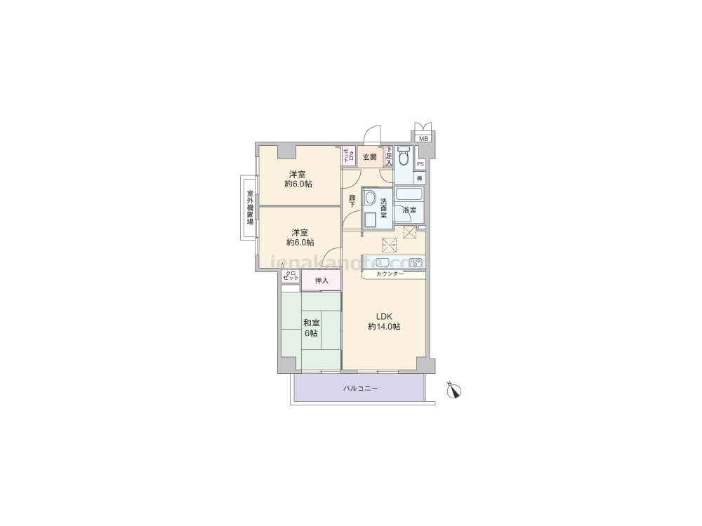 専有面積69.50平米の3LDK。全室6帖以上のゆとりあるプラン。キッチンはカウンタータイプ。家事をしながら家族の様子を伺えます。LDKに和室6帖が隣接しており、襖を開放すれば、約20.0帖の空間としても利用可能。全居室に窓と収納スペースがあります。