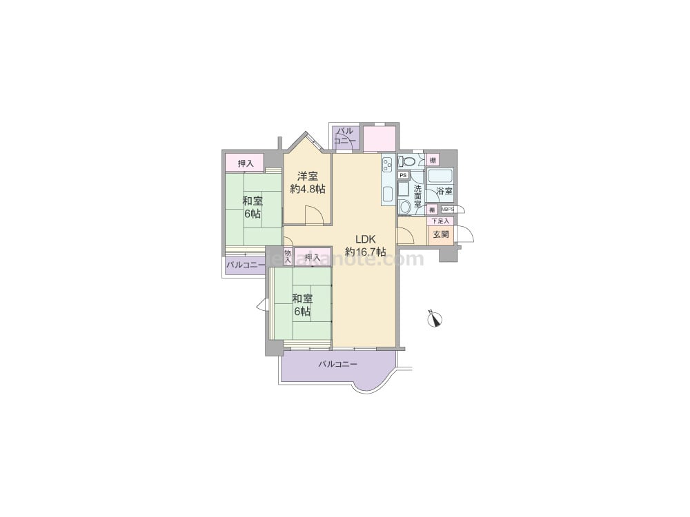 専有面積78.01平米の3LDK。センターイン、ワイドスパンのプランで、3室が南西向きのバルコニーに面しています。廊下が短く、居室空間が広く、各個室には一度LDKを通ってアクセスする為、家族のコミュニケーションの機会が増えます。キッチン横に便利なバルコニー付き。トイレにも窓があります。