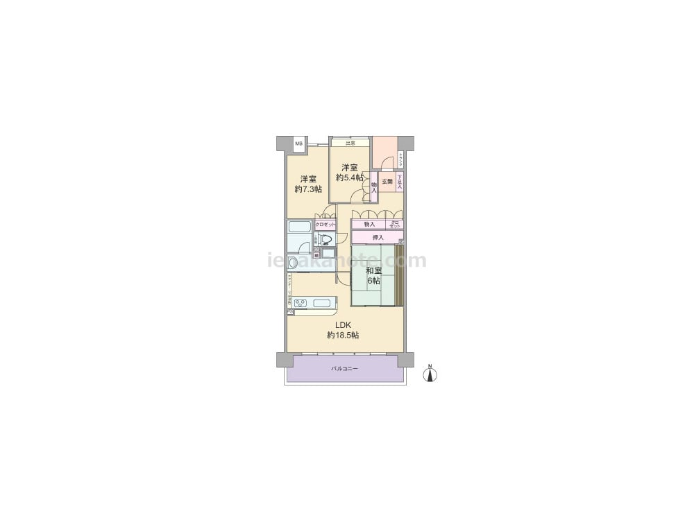専有面積86.73平米の3LDK。玄関前に便利なトランクルーム付き。室内廊下がクランク状になっており、玄関から居室が見渡せずプライバシーが確保されています。LDKと和室が続き間で、繋げて約24.5帖の一つの空間としても使用可能。和室には扉が2カ所にあり、客間や個室としても使いやすくなっています。キッチンは料理中も家族に目が届く、カウンタータイプ。キッチンから洗面室に直接アクセスでき家事動線にすぐれています。各部屋の他、廊下に面して物入付き。主寝室約7.3帖大。バルコニーはゆとりがあり、ガーデンニングも楽しめます。