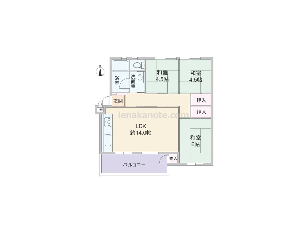 専有面積65.08平米の3LDK。共用廊下に直接面する居室の窓が無い、ワイドスパンのプラン。LDKは約14.0帖大、キッチンは壁付け・オープンタイプで、LDK以外は和室の落ち着いた造りです。和室4.5帖はそれぞれ続き間になっており、襖を開放すれば約9帖の空間としても使用可能。東側の和室4.5帖には収納スペースが無いため、収納家具を置くなどの工夫が必要です。浴室・トイレにも窓があり、トイレは洗面室を通って出入りするためトイレ・洗面室使用時の動線が重なっています。