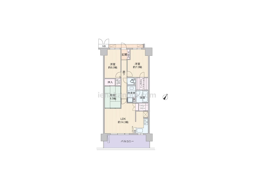 専有面積72.80平米の3LDK。キッチンはバルコニーに面して配置され、使いやすいL字型。すぐ横にパントリーがあります。LDKと和室が続き間で、約18.8帖の一つの空間としても使用可能。和室には扉が二カ所にあり、客間や個室としても使いやすくなっています。主寝室は約7帖の広さがあり、ウォークインクロゼット付き。バルコニーは出幅があり、ガーデニングやテーブルセットを出してアウトドアリビングも楽しめます。