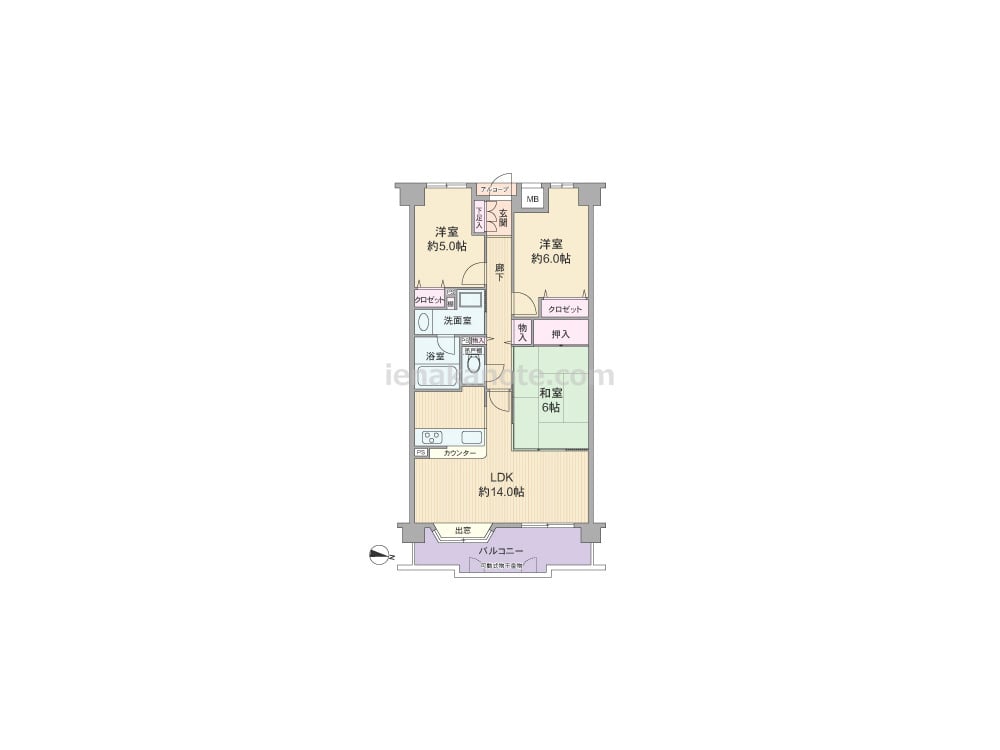 専有面積68.9平米の3LDK。LDK約14.0帖にはバルコニーに面して出窓があります。カウンタータイプのキッチンは、料理中も家族と会話を楽しめる配置。和室6帖は2カ所から出入りでき、LDK側の襖を開放してくつろぎのリビングスペースとして利用してもよさそうです。各居室と室内廊下に収納スペースが設けられています。