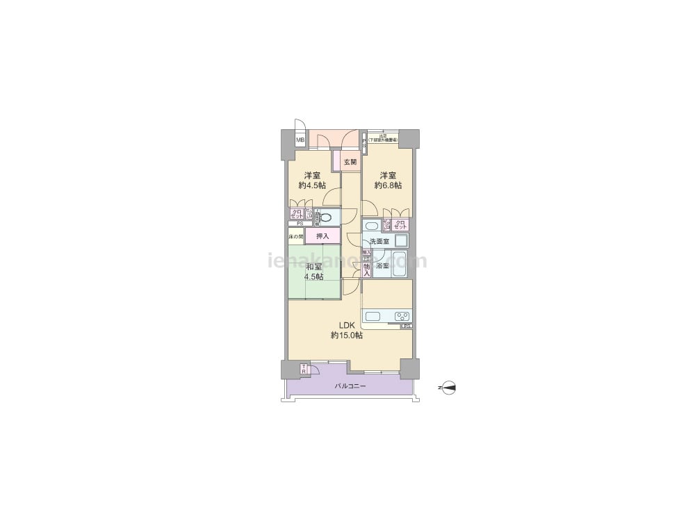 専有面積70.65平米の3LDK。玄関前にはポーチがあります。LDKは約15.0帖、キッチンは作業中も家族の様子を伺える対面カウンタータイプの仕様。和室4.5帖はLDKと室内廊下の2カ所から出入りでき、床の間は花や掛け軸を飾れば、趣ある和の雰囲気を演出できます。収納スペースが各所にあり、バルコニーにあるトランクルームは屋外で使う物を保管するのに便利です。