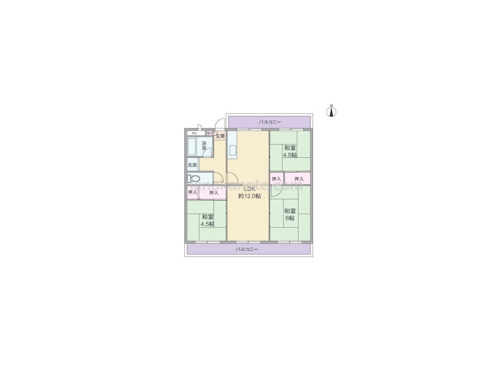 専有面積63.92平米の3LDK。ワイドスパンの和室中心のプランで、LDKを含む3室が南向き。南北両面にバルコニーがあり、全居室がバルコニーに面しています。全居室が続き間の為、生活シーンにあわせてフレキシブルに使うことが出来ます。