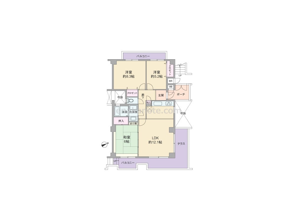 専有面積79.74平米の3LDK。玄関前に専用ポーチがあり、玄関先から室内が見通せない、プライバシー重視のプラン。LDK約12.1帖には和室が隣接しており、襖を開放すれば約18.1帖大の空間に。キッチン・浴室・トイレは吹抜に面して窓があります。各居室と玄関ホールに収納スペース付き。全部屋バルコニーに面しており、バルコニーやテラスではガーデニングを楽しんだり、テーブルセットを置いてカフェテラスにしてもよさそうです。