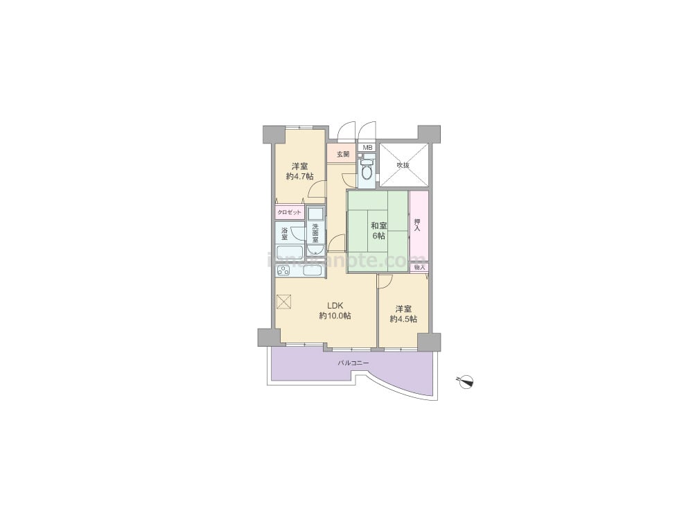 専有面積57.44平米の3LDK。バルコニーに面して3カ所に窓があるワイドスパンのプラン。LDKは約10.0帖、キッチンは壁付け・オープンタイプ。洋室約4.5帖はLDKを通って出入りするため、子供部屋にすれば、自然と親子顔を合わせる機会が増えます。洋室約4.5帖の物入は容量が少ないため、場合により家具の設置が必要です。トイレは吹抜に面して窓があります。バルコニーは約12.1平米とゆとりがあり、テーブルセットを置いてアウトドアリビングにしたり、ガーデニングを楽しむのにもよさそうです。