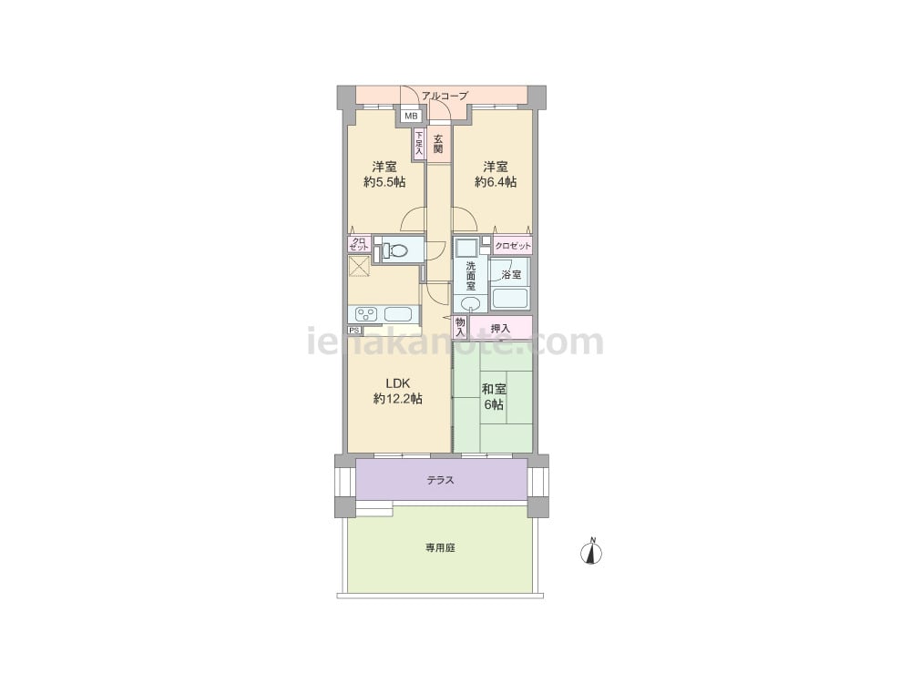 専有面積64.82平米の3LDK。専用庭付きのプラン。共用廊下と玄関・居室の間にはアルコーブがあります。LDK約12.2帖には和室6帖が隣接しており、襖を開放すればリビング・ダイニングをより広々と使う事が可能。キッチンは対面・カウンタータイプの仕様です。洋室約5.5帖のクロゼットは容量が少ないため、家具を置くなど少し工夫が必要。テラスは約8.25平米、専用庭は約18.60平米あり、ガーデニングや家庭菜園はもちろん、子どもの遊び場やアウトドアリビングにもぴったりです。