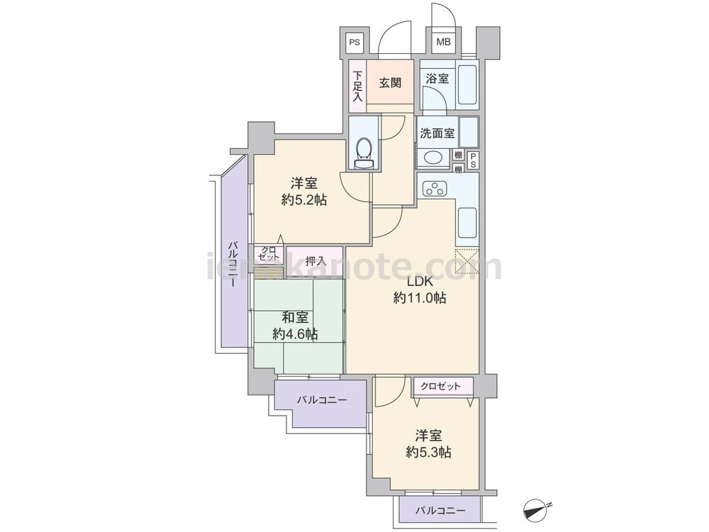 専有面積59.45平米の3LDK。LDKが部屋の中央にあるセンターリビングのプラン。LDKは約11.0帖、キッチンはL字型の壁付け・オープンタイプの仕様。和室約4.6帖の引き戸を開放すれば、リビング・ダイニングをより広々と使う事が出来ます。各居室に収納があり、浴室の窓は換気がしやすく快適。バルコニーが全部で3カ所あり、ガーデニングを楽しむのによさそうです。