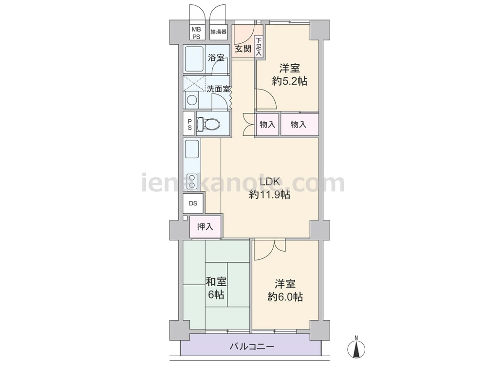 専有面積64.80平米の3LDK。玄関扉は防犯性に配慮された内開き型です。LDKが部屋の中央にあるセンターリビングのプランで、キッチンは空間を有効利用できるI型のウォールタイプ。洋室約6.0帖にはクロゼットがありませんが、その他の居室と玄関ホールに収納スペース付きです。トイレと洗面室の動線が重なっているため、使用時には注意が必要かもしれません。