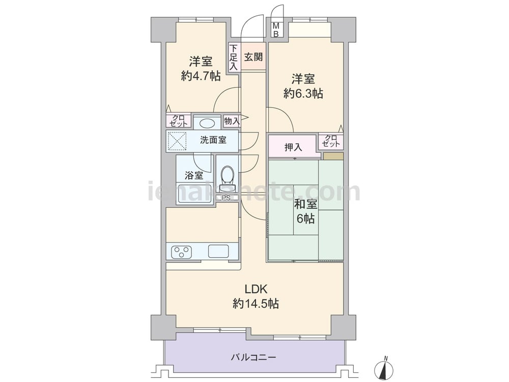 専有面積68.41平米の3LDK。横長リビングのプラン。LDK約14.5帖には和室6帖が隣接しており、引き戸を開放すれば約20.5帖大の空間にする事が出来ます。キッチンは作業中も家族と会話を楽しめる対面タイプ。各居室と室内廊下に収納が確保されています。