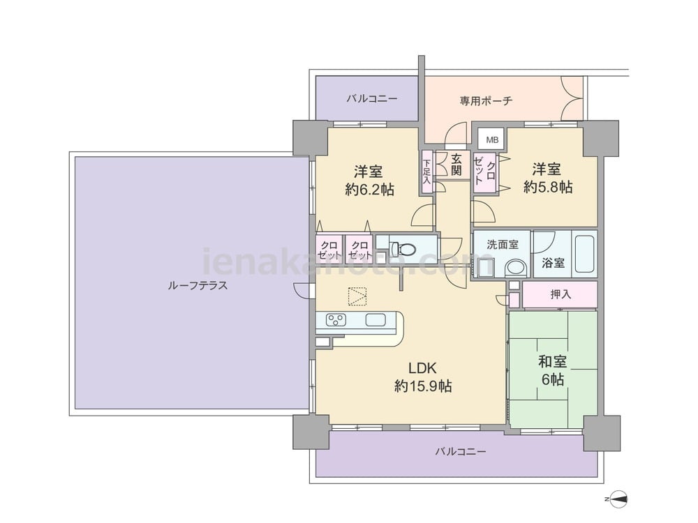 専有面積72.08平米の3LDK。玄関前に専用ポーチがあり、共用廊下に直接面する窓が無い、プライバシー重視のプラン。LDKは約15.9帖、キッチンは対面カウンタータイプの仕様。和室の引き戸を開放すれば、約21.9帖大の空間に利用出来ます。各居室とLDKに収納スペース付き。ルーフテラスは約54.69平米と大変広く、テーブルセットを置けば景色を眺めながら食事やティータイムを楽しめます。