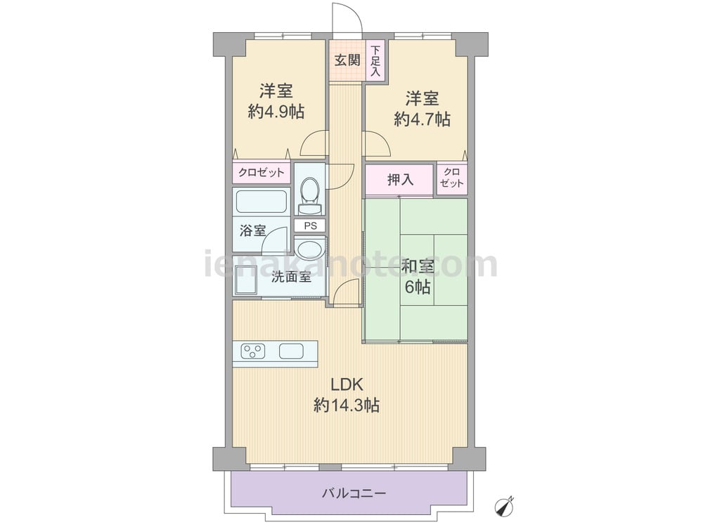 専有面積67.1平米の3LDK。横長リビングのプラン。LDKは約14.3帖、オープンキッチンの背面には洗面室への扉があります。和室6帖は2カ所から出入りでき、来客時には室内廊下から出入りする客間に利用する事も可能。各居室に収納が設けられています。