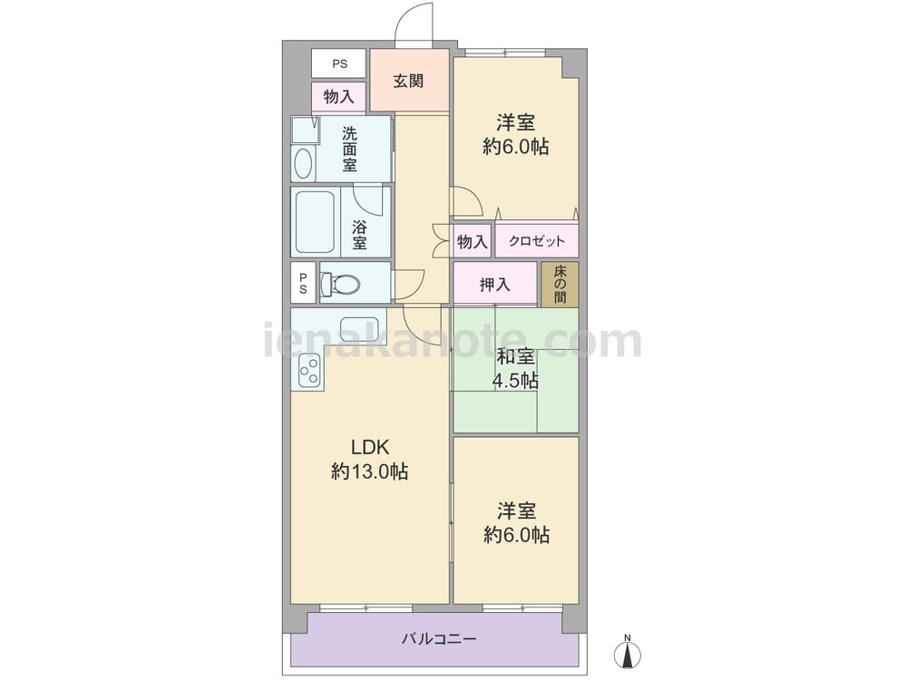 専有面積72平米の3LDK。LDKは約13.0帖、キッチンはL字型のウォールタイプ。LDKに隣接する洋室約6.0帖、和室4.5帖の引き戸を開放すれば、LDKを広々と使う事が出来ます。バルコニーに面する洋室約6.0帖にはクロゼットがありませんが、その他の居室と室内廊下、洗面室に収納付き。和室には床間もあります。