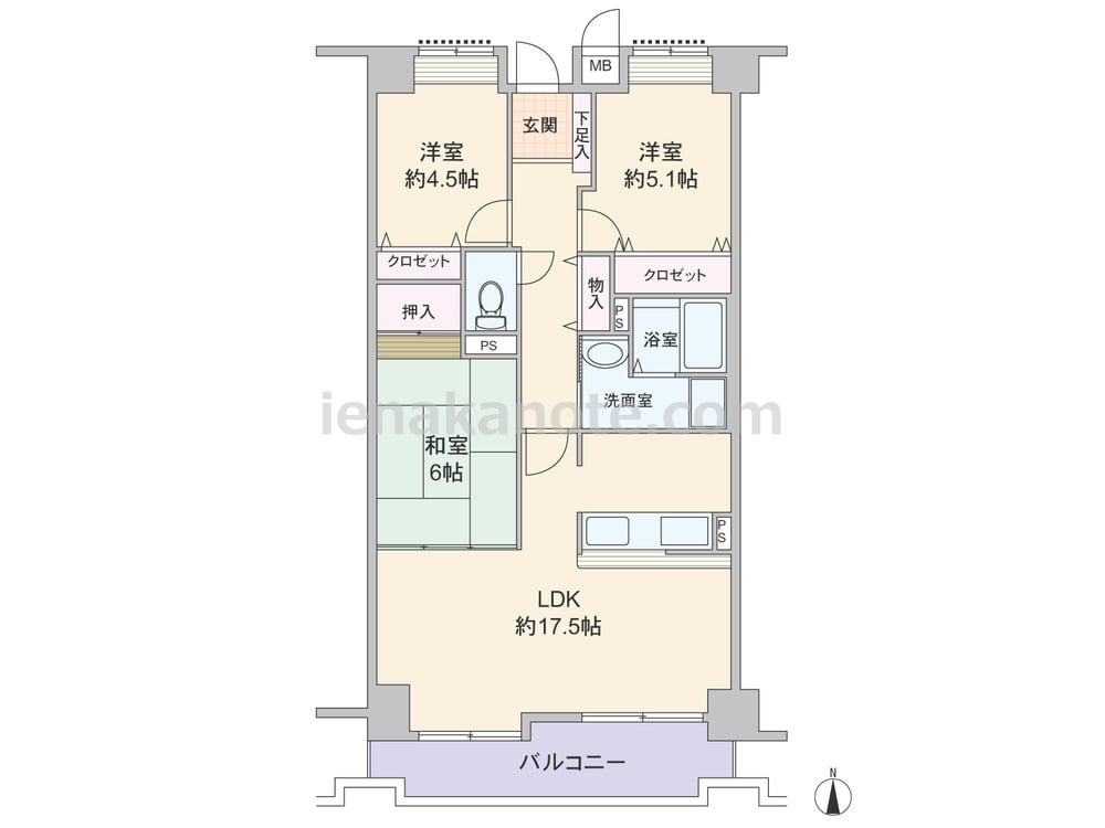 専有面積75.44平米の3LDK。LDKは約17.5帖、キッチンは作業中も家族と会話を楽しめる対面カウンター仕様です。和室6帖はLDKから出入りする造り。襖を開放すれば、LDK約23.5帖大としても使用可能。各居室と室内廊下に収納スペースが設けられています。