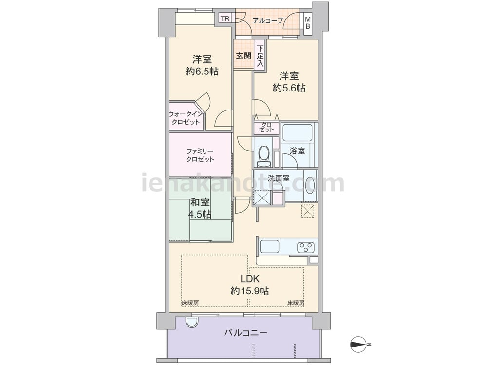 専有面積76.22平米の3LDK。玄関前にアルコーブ、トランクルームが付いたプラン。LDK約15.9帖と続き間の和室の引き戸を開放すれば、約20.4帖大の空間にする事が可能。キッチンは対面カウンター式で、洗面室へアクセス可能な2WAY動線です。大容量のファミリークロゼットや、洋室約6.5帖にはウォークインクロゼットがあり、収納スペースが豊富。スロップシンク付きのバルコニーは約11.88平米あります。