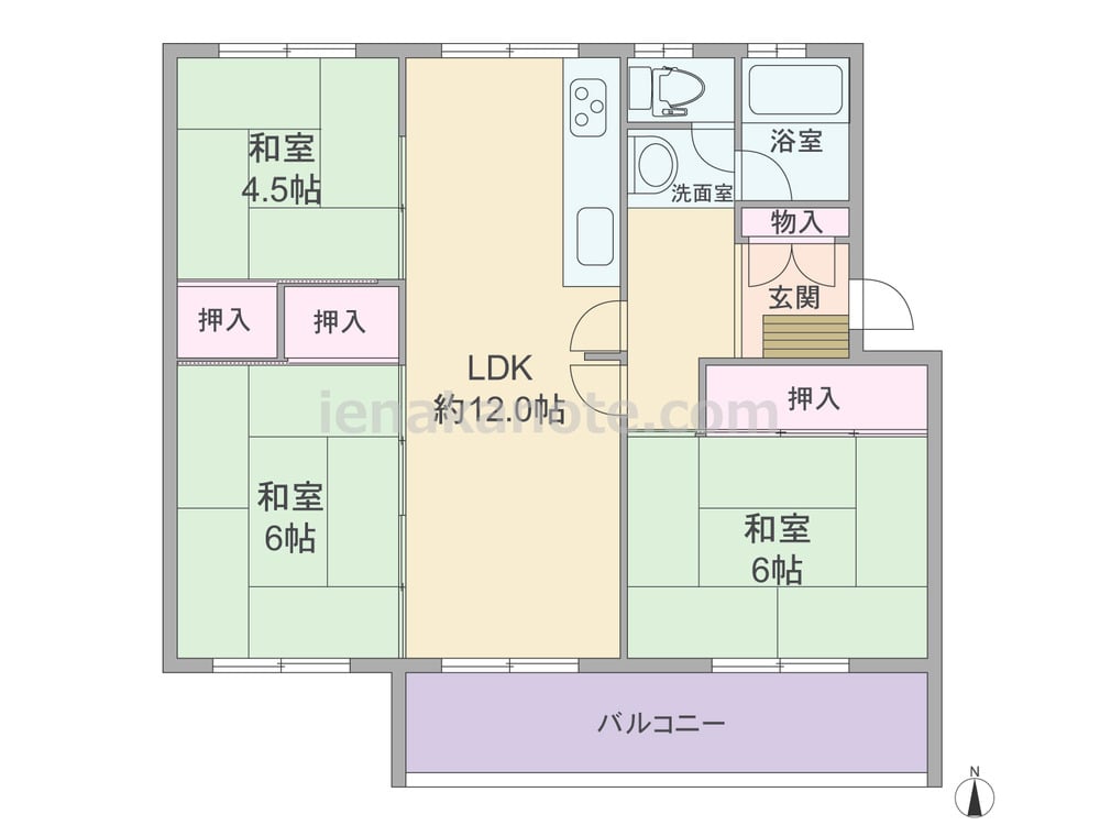 専有面積66.45平米の3LDK。南北両面に窓がある、センターインのプラン。LDK約12.0帖以外は和室の落ち着いた造りで、LDKと続き間の4.5帖、6帖の引き戸を開放すれば空間をより広々と使う事も可能です。キッチンはI型のウォールタイプ。各居室と玄関に収納スペース付き。トイレ・浴室の窓は換気がしやすく快適です。