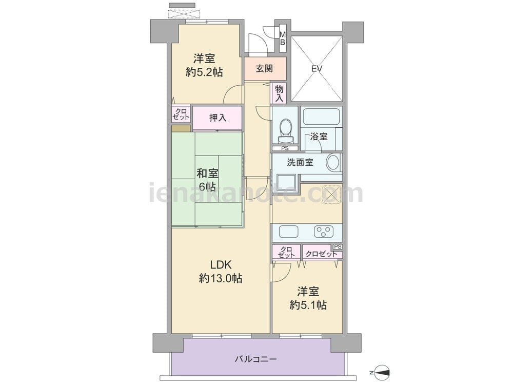 専有面積63.48平米の3LDK。独立型のキッチンはリビング・ダイニングへ生活感が伝わりにくいのが特徴。LDK約13.0帖に隣接する和室の引き戸を開放すれば約19.0帖大の空間に利用でき、和室は室内廊下からも出入りできます。洋室約5.1帖はLDKを通って出入りするため、子供部屋にすればコミュニケーションの機会が増え安心。各居室と室内廊下に収納があり、バルコニーは約10.20平米とゆとりがあります。
