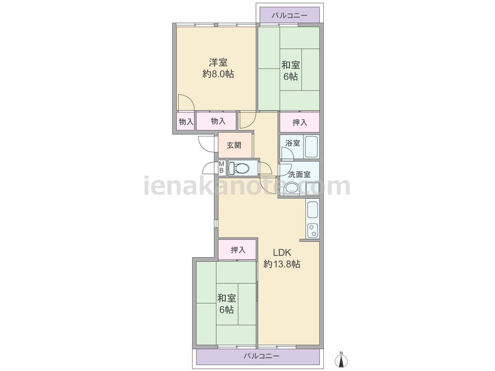 専有面積75.36平米の3LDK。どの部屋も6帖以上のゆとりが確保された、センターリビングのプラン。玄関先から室内を直接見通せない、プライバシーを保ちやすい造りです。LDKは約13.8帖、キッチンはI型の壁付けタイプ。南北両面にバルコニーは約8.85平米あり、収納は各居室に設けられています。