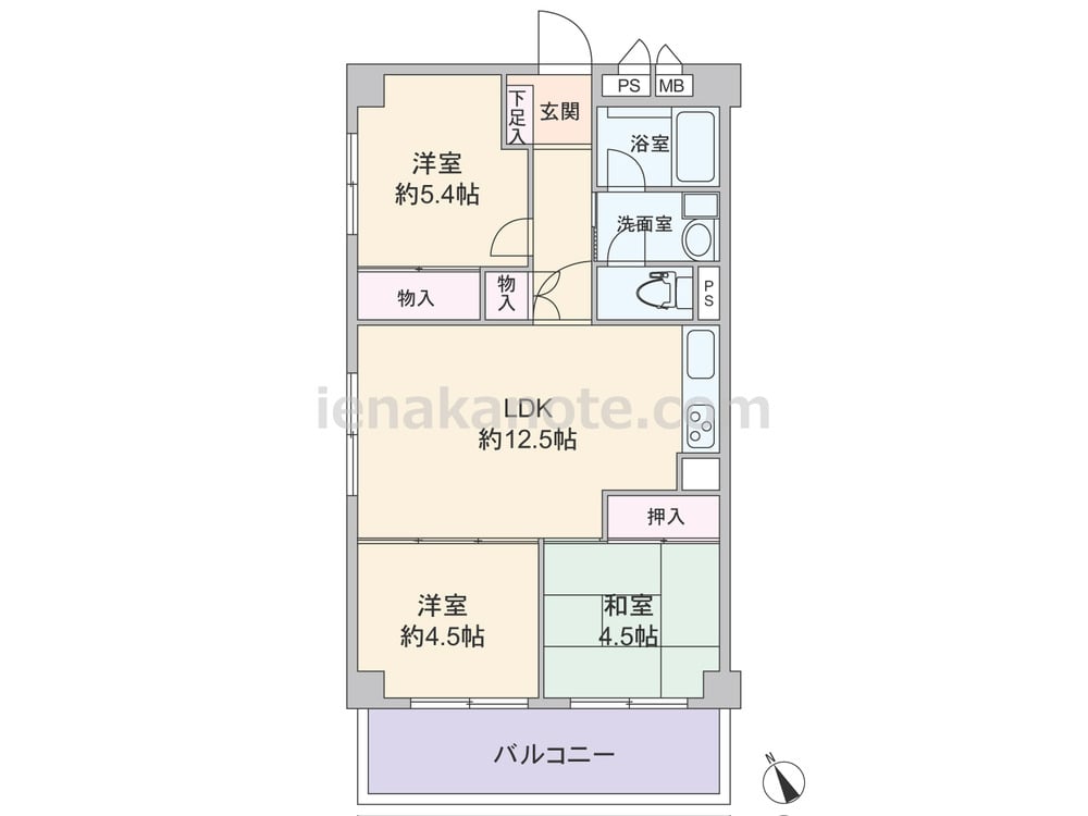 専有面積60.5平米の3LDK。LDK約12.5帖が部屋の中央にあるセンターリビングのプラン。LDKに隣接する洋室約4.5帖の引き戸を開放すればLDK約17.0帖にプラン変更できます。ただ、洋室約4.5帖には収納が無いため、家具を置くなど少し工夫が必要です。その他の居室と室内廊下は収納スペース付き。トイレは洗面室を通って出入りします。