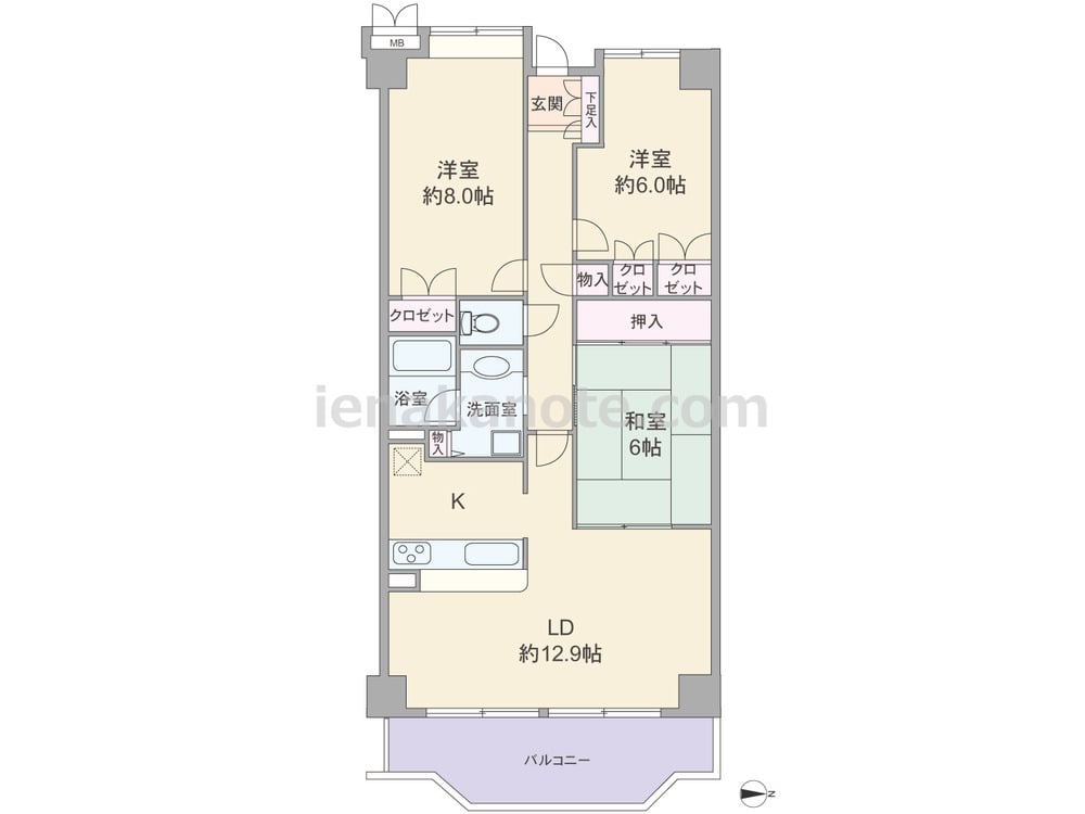 専有面積80.13平米の3LDK。全部屋6帖以上のゆとりがあるプラン。リビング・ダイニングは約12.9帖で、対面式キッチンは料理をしながら家族と会話を楽しめます。和室6帖は室内廊下とリビング・ダイニングの2カ所から出入りが可能。各居室に収納があり、洗面室、室内廊下も物入付き。バルコニーは約10.97平米あります。