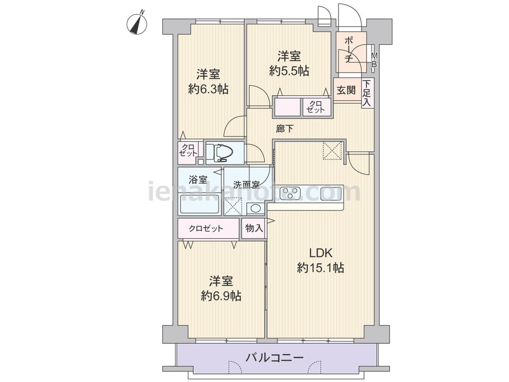 専有面積77.71平米の3LDK。玄関前に専用ポーチがあります。LDK約15.1帖と洋室約6.9帖は続き間で、引き戸を開放すればLDK約22.0帖大にプラン変更が可能。キッチンはリビング・ダイニングを見ながら作業が出来る対面カウンター式で、キッチン横には洗面室への扉があります。各居室とLDKに収納スペース付き。バルコニーは約16.16平米とゆとりがあり、テーブルセットを置けばカフェ気分を味わえます。