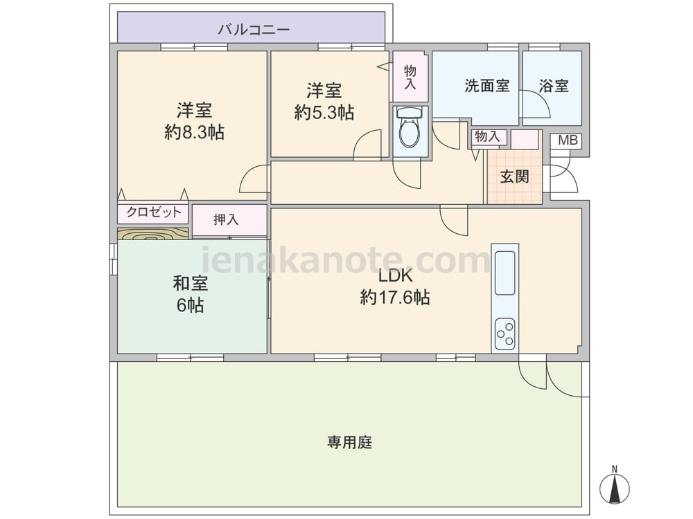 専有面積84.01平米の3LDK。専用庭付きプラン。LDKは約17.6帖とゆとりがあり、対面式キッチンからリビングスペースを見渡す事が出来ます。和室6帖の引き戸を開放すれば約23.6帖大の空間に利用でき、和室を小さい子供の遊び場・お昼寝スペースにすれば、料理中も目が届きやすく安心です。各居室と玄関ホールに収納スペース付き。専用庭は約40.46平米と大変広く、ガーデニングをたっぷり楽しめるほか、テーブルセットを置けばアウトドアリビングにする事も出来ます。