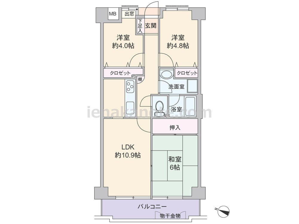 専有面積59.17平米の3LDK。独立型のキッチンはリビング・ダイニングへ生活感が伝わりにくく、LDK約10.9帖に隣接する和室の引き戸を開放すれば約16.9帖大の空間に利用できます。各居室に収納スペースがあり、室内廊下には小物のディスプレイを楽しめる棚付きです。バルコニーは約10.9平米あります。