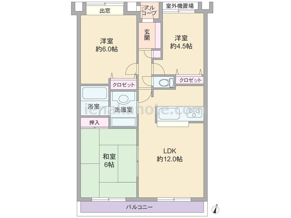 専有面積62.11平米の3LDK。LDKは約12.0帖、キッチンは作業をしながら家族の顔が見える対面式。LDK横の和室6帖はくつろぎのリビングスペースや個室など、生活シーンに合わせて色々な使い方が出来ます。各居室と室内廊下に収納スペース付き。バルコニーは約10.32平米とゆとりがあります。
