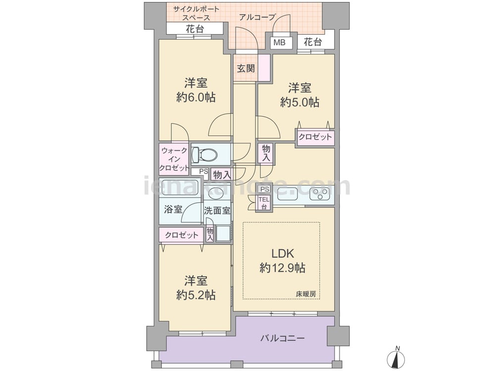 専有面積63.22平米の3LDK。共用廊下と玄関・居室の間にはアルコーブ、花台、サイクルポートスペースがあります。LDKは約12.9帖、キッチンは対面式で、洗面室(洗濯機置場)への距離が近い家事効率の良い造り。洋室約5.2帖の引き戸を開放すればLDK約18.1帖にプラン変更が可能。洋室約6.0帖はウォークインクロゼットがあり、その他にも収納が各所に設けられています。